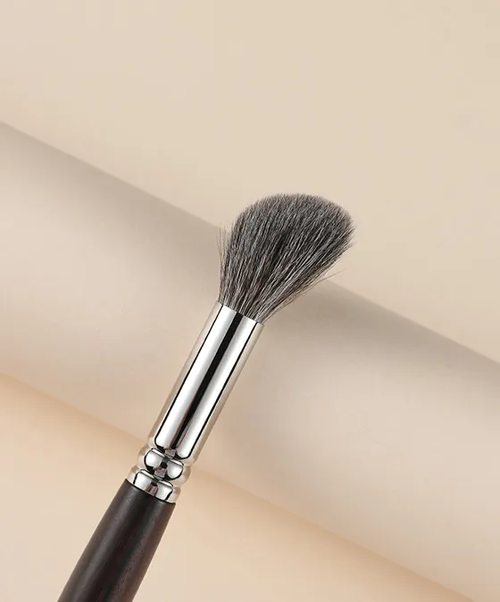 • After building radiance, use the round edge to blend brow bone and forehead, or diffuse transition highlighter across high points. The soft blue squirrel hair delivers highlighter effortlessly, achieving a luminous, professional finish without patchiness.