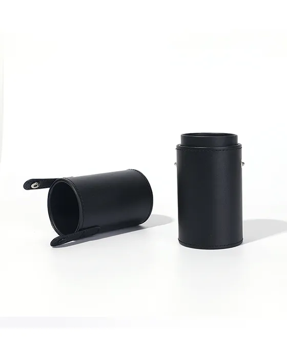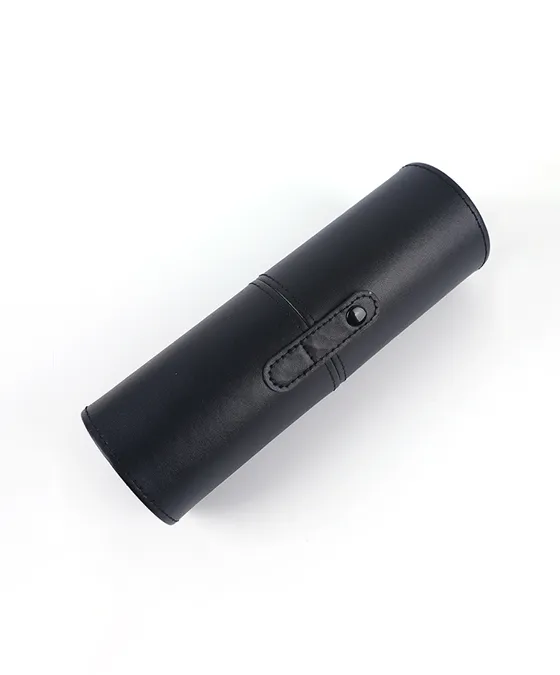 Compact PU leather makeup brush holder cup. Premium synthetic leather with buckle secures small brush sets, ideal for travel and vanity organization.